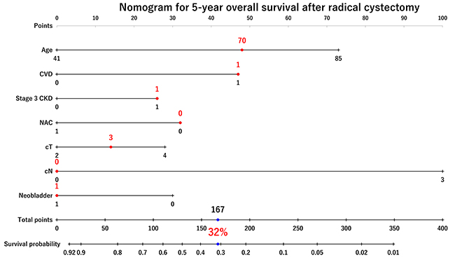 Figure 5: Nomogram for 5-year overall survival probability. The nomogram predicting 5-year OS showed that NAC use improved the 5-year risk of OS from 32% to 48% (a 16% improvement) in 70-year-old patients with CVD+, stage 3 CKD, cT3, cN-, and indication for orthotopic ileal neobladder substitution.
