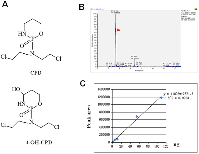 Figure 1: The identification of conditioned medium (CM)-CPD working solution. (A) Chemical structure of cyclophosphamide (CPD) and its medial metabolic product (4-OH-CPD) that can be detected in the conditioned medium working solution. (B) The LC/MS/MS chromatograms of 4-OH-CPD (as indicated by the arrow) in CPD-H (4000μM) in multiple reaction monitoring (MRM) mode. (C) Standard curve were made with 10 times serial dilution of 4-Hydroperoxy CPD.
