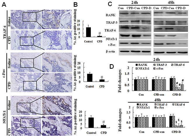 CPD inhibited the expression of TRAF-6, NFATc1 and c-Fos in mice or in BMMs