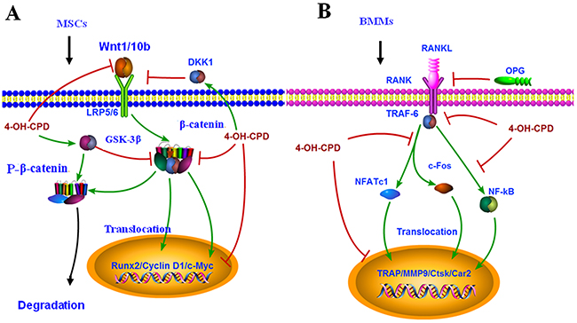 Cyclophosphamide (CPD) was purchased from Shengdi Company (Jiangsu, China). M-CSF and RANKL were purchased from Peprotech (New Jersey, USA). Primary antibodies against active β-catenin, Runx2, Cyclin D1, c-Myc, IκBα, phospho-IκBα, JNK, phospho-JNK, p38 and phospho-p38 were purchased from Cell Signaling Technology (Beverly, MA, USA) and others against TRAF-6, TRAF-3, NFATc1, RANK and c-Fos were purchased from Santa Cruz Biotechnology (CA, USA). The antibodies against β-catenin, phospho-Gsk-3β, and DKK1 were purchased from Abcam Company (Cambridge, UK).