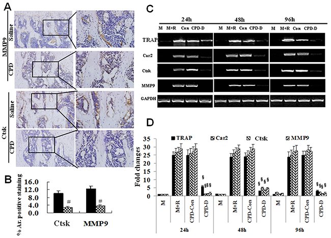 RANKL up-regulates the differential expression of numerous genes, which are not only requirement for normal osteoclastogenesis but also necessary for bone resorption [46]. Particularly, bone resorption activity was determined by a series of RANKL-stimulated resorptive factors, including MMP9, Car2, Ctsk and TRAP [40], the expression of which were measured in this study. The results demonstrated that the protein expression of MMP9 and Ctsk was significantly down-regulated in CPD-treated group as compared to those in saline control group (P < 0.05, Figure 9A and 9B).