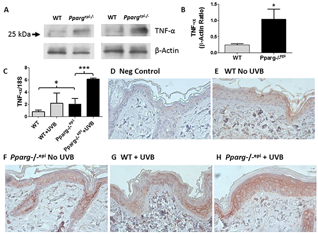 Figure 1: Increased TNF-α consistent with tmTNF-α is observed in Pparg-/-epi mice both prior to and after UVB irradiation. (A) Increased TNF-α protein is produced under normal physiologic conditions in the epidermis of Pparg-/-epi mice relative to WT mice. WT and Pparg-/-epi mice were euthanized and the epidermis was removed from the dorsal skin for protein extraction and TNF-α immunoblot. After stripping, a β-actin immunoblot was performed to assess loading. Representative immunoblots from epidermal preparations of two different WT and Pparg-/-epi mice are shown. Only an approximately 26 kDa protein was observed by anti-TNF-α immunoblot. A 17 kDa protein that would correspond to solTNF-α was not observed (not shown). (B) Quantitative assessment of TNF-α protein in epidermal lysates normalized to β-actin. TNF-α protein levels were normalized to β-actin. Mean & SEM, *, p<0.05; n= epidermal lysates from 5 mice/genotype. (C) TNF-α mRNA expression in WT and Pparg-/-epi mice. Mice were irradiated with 1500 J/m2 UVB. After 24 hours, the mice were euthanized, the skin excised, frozen in liquid N2, and the epidermis was scraped off for RNA extraction & quantitative RT-PCR (qRT-PCR). TNF-α expression in epidermal scrapings was normalized to 18 S rRNA. Mean and SEM, n=4-6 mice per experimental group. *, p<0.05; ***, p<0.001, 2-tailed t-test. (D-H) TNF-α protein expression localized to the epidermis following UVB irradiation is increased in Pparg-/-epi mice. Mouse skin was excised 24 hours after a 1500 J/m2 UVB treatment and formalin fixed and paraffin-embedded. Immunolabeling was then performed using an anti-TNF-α antibody (α-TNF). D.) Representative photomicrograph of a control in which staining was performed in the absence of the primary antibody. E-H.) Representative images of TNF-α expression within the epidermis of WT and Pparg-/-epi mice treated with or without UVB. Both UVB treatment and loss of epidermal Pparg were associated with an increase in staining consistent with localization to the cell membrane. All images are 400x and are representative of TNF-α immunolabeling performed on at least 3 different mice per treatment group.