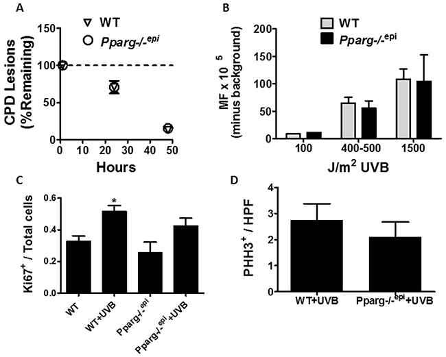 Pparg-/-epi mice fail to exhibit alterations in UV-induced CPD repair or mutation frequency or proliferative responses to UVB
