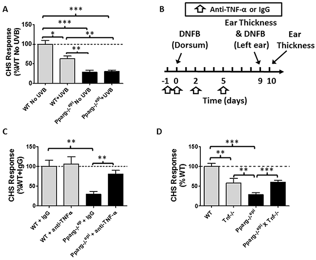 Figure 5: Pparg-/-epi mice exhibit a marked defect in the contact hypersensitivity (CHS) response that is not affected by UVB exposure but is suppressed by anti-TNF-α neutralizing antibodies. (A) Pparg-/-epi mice are immunosuppressed using a CHS model. WT and Pparg-/-epi mice were treated with or without UVB (7500 J/m2) on the dorsal skin at a site distant to where the mice were initially sensitized to the hapten dinitrofluorobenzene (DNFB). Initial DNFB sensitization of the mice occurred five days after UVB treatment. Nine days after the initial DNFB sensitization, ear thickness was measured and DNFB was applied to one ear while the other ear was treated with vehicle. The change in ear thickness was assessed 24 hours after DNFB challenge and is plotted as the change in ear thickness after subtracting the thickness of the contralateral ear treated with vehicle alone. Results represent the change in ear thickness measurements as a percent of non-UVB treated control SKH1 wildtype mice. Results represent the mean ± SEM for 6 non-UVB treated and 4 UVB-treated mice per genotype. (B) Timeline for neutralizing anti-TNF-a studies. WT SKH1 and Pparg-/-epi mice were injected intraperitoneally (ip) with 250 μg of either anti-TNF-α or isotype control on days -1, 0, 2 and 5. On day 0, the dorsal skin of the mice were sensitized with 0.5% DNFB. CHS responses to DNFB challenge were assessed 9 days later by measuring ear thickness and applying DNFB to the left ear and vehicle to the right ear. Ear thickness was re-measured 1 day later. (C) Anti-TNF-α antibody treatment (anti-TNF-α) reversed the impaired CHS response observed in Pparg-/-epi mice, but has no effect on CHS responses in WT mice. Mice were treated as described in Figure 5C. Results represent the percent change in ear thickness measurements compared to wildtype SKH1 mice treated with control IgG alone. Mean and SEM for n=5-6 mice per experimental group. (D) Germline loss of Tnf (Tnf-/-) partially reverses the impaired CHS response in Pparg-/-epi mice. WT mice, Tnf-/- mice, Pparg-/-epi mice, and Pparg-/-epi x Tnf-/- double knockout mice were sensitized with DNFB. After 7 days, a DNFB challenge was applied to the left ear and ear thickness was measured. CHS responses (as a percentage of WT response) were assessed. Mean and SEM, n=8 (WT), n=16 (Pparg-/-epi), n=6 (Tnf-/-), and n=10 (Pparg-/-epi X Tnf-/-). *, p<0.05; **, p<0.01; ***, p<0.001, 2-tailed t-test. In the absence of any stimulation, there was no significant difference in baseline ear thickness measurements between WT, Pparg-/-epi, Tnf-/-, or Pparg-/-epi X Tnf-/- mice (0.247 ± 0.019 mm, n=18; vs 0.251 ± 0.024 mm, n=27 vs. 0.235 ± 0.014, n=10 vs 0.249 ± 0.012, n=14; respectively).