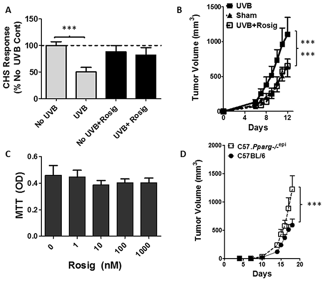 Figure 6: Rosiglitazone (Rosig) reverses UVB-induced immunosuppression and UVB-induced B16F10 tumor growth while intradermal B16F10 tumor growth is increased in mice lacking epidermal Pparg. (A) Rosig treatment reverses UVB-induced immunosuppression (UV-IS). SKH1 mice were treated with Rosig or normal water for 10 days prior to treatment of the shaved dorsal epidermis with/without 7500 J/m2 UVB to a site distant from DNFB sensitization. Rosig treatment was maintained throughout the experiment. Following DNFB sensitization, CHS responses to DNFB reapplication to non-UVB treated ears were measured 9 days later as in Figure 5. Results are shown as a percentage change from non-UVB/non-Rosig treated control mice (No UVB) and are depicted as the mean and SEM (n=7 mice / group). ***, p<0.001; 2-tailed t-test. (B) Rosig treatment reverses UVB-induced B16F10 tumor growth. C57BL6 mice were introduced to Rosig or water for 10 days prior to tumor cell injection. Just prior to tumor cell injection, and on days 6 and 12 thereafter, anesthetized mice were treated with/without 5000 J/m2 UVB at a site distant from tumor cell injection. B16F10 melanoma tumor cells (5x105) were injected subcutaneously into the rear hindlimbs and tumor growth monitored. Mean and SEM shown (n=12/group). Tumor growth was significantly increased in UVB treated mice relative to non-UVB treated (Sham) or UVB treated mice that were also treated with Rosig (UVB+Rosig). ***, p<0.001; 2-way ANOVA. (C) Rosig does not significantly alter B16F10 tumor cell growth in vitro. B16F10 tumor cells were grown in the presence of vehicle (0) or increasing concentrations of Rosig. After 48 hours, cell proliferation was assessed by quantitating viable cells by MTT assay. The results represent the mean and SEM of n=5 separate assays done in quadruplicate wells. (D) Subcutaneous B16F10 tumors grow significantly faster in syngeneic mice lacking epidermal Pparg (C57.Pparg-/-epi mice). C57BL6 mice with epidermal specific deletion of Pparg were generated (C57. Pparg-/-epi mice) to allow for syngeneic tumor growth studies. B16F10 tumor cells (5x104) were injected into the hindlimbs of WT or C57.Pparg-/-epi mice and tumor size was monitored. At day 18, the mean tumor size in C57.Pparg-/-epi mice was 2.07-fold greater than that observed in WT mice (mean ± SEM of 590.9 ± 334 and 1221.9 ± 677.6 for 10 tumors in WT and 8 tumors in C57.Pparg-/-epi mice respectively). ***, p<0.001, 2-way ANOVA,.