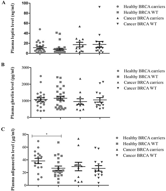 When the biomarker plasma expression was evaluated with respect to BRCA mutation status in patients and healthy subjects separately (Figure 1C), an higher level of adiponectin was shown in BRCA mutated than in BRCA wild type healthy subjects (38.3 vs 26.8 μg/ml, respectively, p < 0.038); no further significant differences were found for leptin and ghrelin with respect to BRCA status and disease status (Figure 1B–1C).