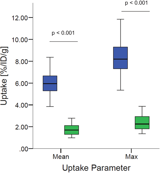 Figure 2: Boxplots of PET-derived mean %ID/gmean and %ID/gmax of tumor tissue comparing [68Ga]Pentixafor (green) and [18F]FDG (blue). Tumor uptake of [68Ga]Pentixafor is significantly lower compared to [18F]FDG (p < 0.001, each).