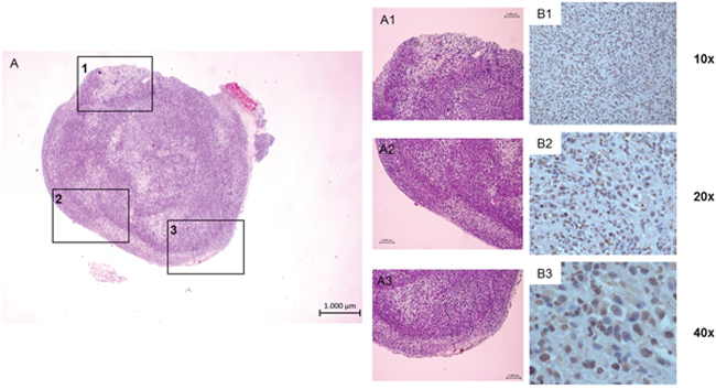 Figure 6: Image example of ex vivo tumor staining of a subcutaneous PC-3 tumor. H.-E. staining: (A) overview of one transaxial slice, (A1-A3) amplification of three exemplary tumor regions. Labeling of CXCR4 positive cells using anti human CXCR4 antibody (brown), slices counterstained with hemalaun to visualize CXCR4 negative cells (blue) (B1-B3), different amplifications).