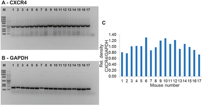 Figure 7: Results of mRNA analysis for assessment of ex vivo CXCR4 expression in tumor tissue. Stained bands of PCR products of CXCR4 (A) and GAPDH (B). Diagram showing relative mRNA expression of CXCR4 assessed densitometrically and normalized to GAPDH (C).