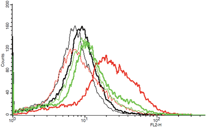 Figure 8: Example of one flow cytometric measurement showing graphs of fluorescence intensity (FL2-H) of IgG isotypic controls and CXCR4 in untreated, methanol-treated and TWEEN20-treated PC-3 cells, respectively (thin graphs: IgG isotypic controls, bold graphs: CXCR4; black: untreated cells, red: methanol-treated cells, green: TWEEN20-treated cells, respectively). Permeabilisation of cells shows a positive shift in fluorescence intensity.