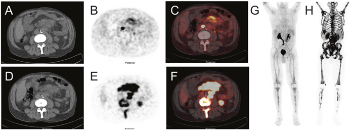 Figure 9: Image example of a clinically indicated [68Ga]Pentixafor PET/CT scan of a 74 year old patient with castration-resistant metastasized prostate cancer after all approved systemic therapies. [68Ga]Pentixafor shows only faint or no increased uptake in disseminated nodal and bone metastases (whereas metastases are highly PSMA-positive on [68Ga]PSMA PET/CT) Transaxial sliced of (A) CT, (B) [68Ga]Pentixafor PET, (C) fused [68Ga]Pentixafor PET/CT and (D) CT, (E) [68Ga]PSMA PET, (F) fused [68Ga]PSMA PET/CT; maximum intensity projection of (G) [68Ga]Pentixafor PET and (H) [68Ga]PSMA PET.