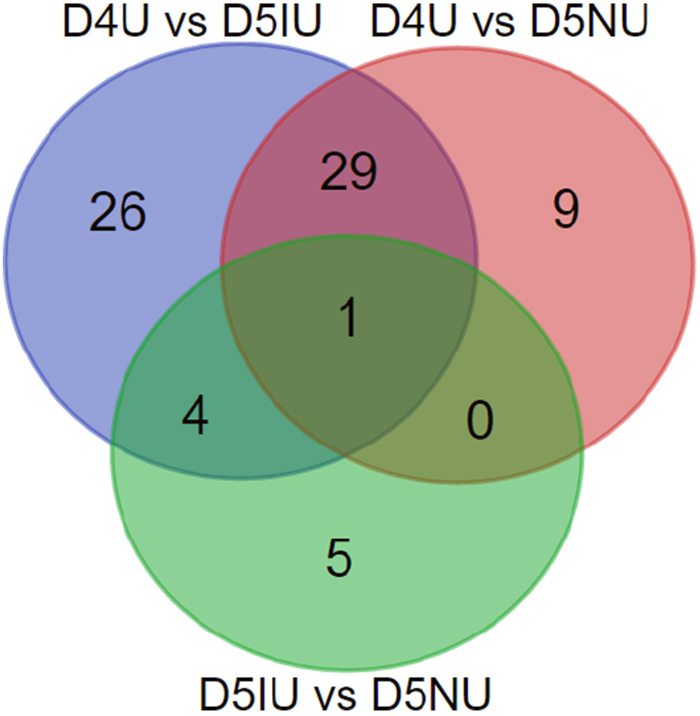 Figure 2: Venn diagrams of the differentially expressed lncRNA transcripts in three comparison groups during the implantation window. Differential expression analysis was performed using the Cuffdiff program basing on FPKM value derived from Cufflinks, and p-values less than 0.05 were considered as significantly differentially expressed between two groups.
