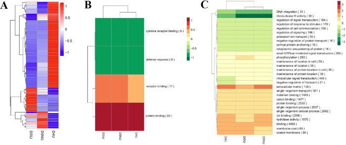 Figure 3: Hierarchical clustering analysis of differentially expressed lncRNAs in mouse uterus during the implantation window. (A) The heat map of differentially expressed lncRNAs in the three comparison groups. Red indicates higher expression and blue indicates lower expression. Enrichment analysis of GO terms for differentially expressed lncRNAs in cis (B) and trans (C) from the three comparison groups. Red and green show higher and lower expression, respectively.