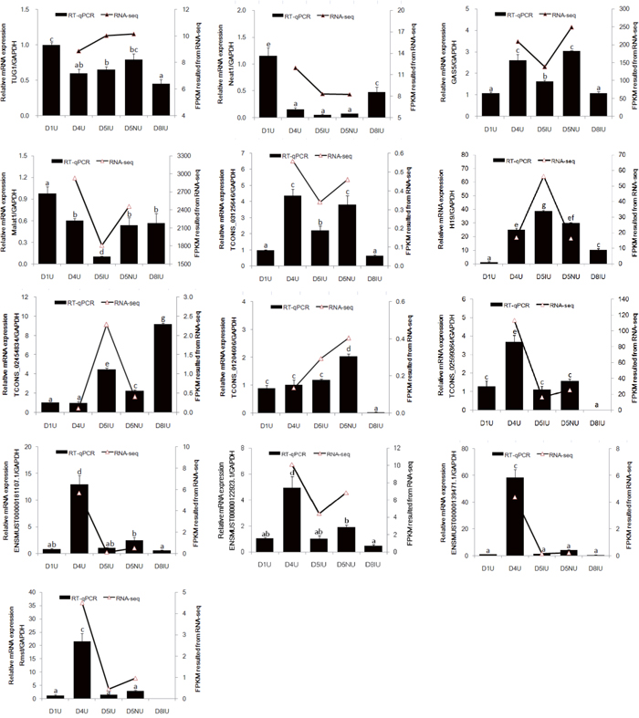 Figure 4: qRT-PCR validation of 13 differentially expressed lncRNAs in RNA-seq data. The mouse uterine sample on pregnant day 1 (D1U), day 4 (D4U), day 5 at implantation sites (D5IU) and inter-implantation sites (D5NU) and day 8 at implantation sites (D8IU) were collected, respectively. LncRNAs expression was normalized with GAPDH using the 2−ΔΔCt analysis method. The data are expressed as the mean ± S.E.M. from three replicates, and the bar bearing different superscript indicates a significant difference between the mean values (P < 0.05).