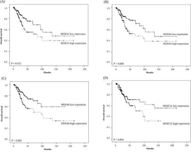 In Kaplan–Meier survival analyses, we found that groups with higher HOXA1, HOXA5, and HOXA6 mRNA expression levels had significantly unfavorable overall survival than those with a lower level of expression of these genes (P = 0.012, P = 0.008, and P = 0.006, respectively) (Figure 1).