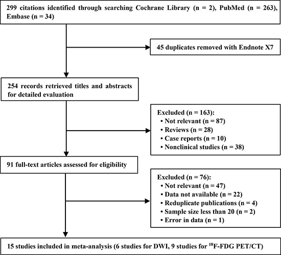 A total of 299 articles were screened in the primary literature search. After removing the ineligible study in each step, 15 studies (six studies [46–51] for DWI and nine studies [21, 38–41, 52–55] for 18F-FDG PET/CT were finally selected on basis of the inclusion and exclusion criteria. A flowchart depicting the study selection process is shown in Figure 1.