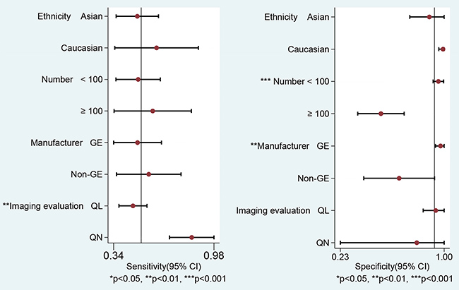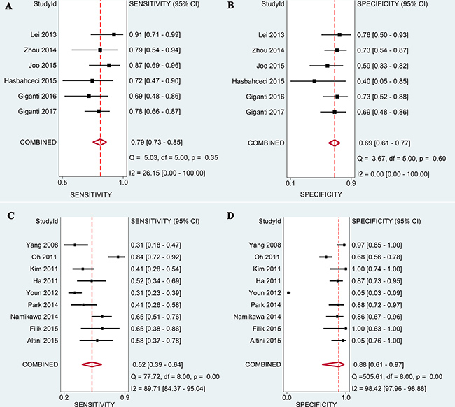 To better understand the diagnostic performance of the two imaging techniques, we took the performance of MDCT for nodal staging of GC as a reference. The pooled estimates of sensitivity, specificity and AUC with 95% CIs was derived from Wang’s meta-analysis, which was published in 2015 [43].