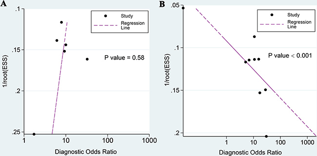 Deeks’ funnel plots were to determine potential publication bias for DWI and 18F-FDG PET/CT in assessing preoperative N-staging of primary GC subjects. Stata 14.0 software was used to run all the statistical analyses. Values of P < 0.05 were considered statistically significant.