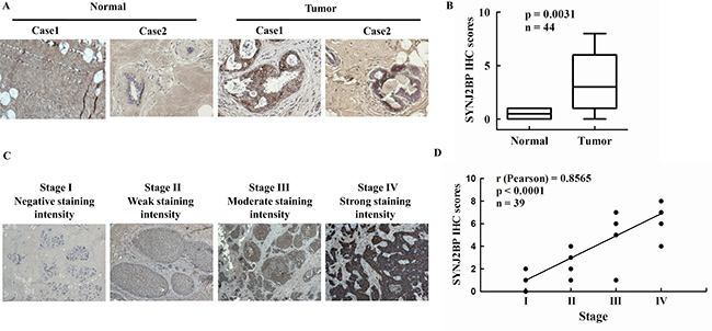 Figure 1: The expression of SYNJ2BP in breast tumor tissue samples. (A) Immunohistochemistry analysis of SYNJ2BP expression in normal breast tissues and breast tumor tissues. (B) Expression levels of SYNJ2BP in breast cancer sample (n = 39) and normal breast sample (n = 5). Box indicates the median and the interquartile range, and whiskers represent minimum and maximum. (C) Immunohistochemistry analysis of SYNJ2BP expression in breast cancer progression from TNM stage I to IV. (D) The correlation of SYNJ2BP level and tumor stage in breast tumors. The r and p-values were obtained by Pearson’s correlation analysis.