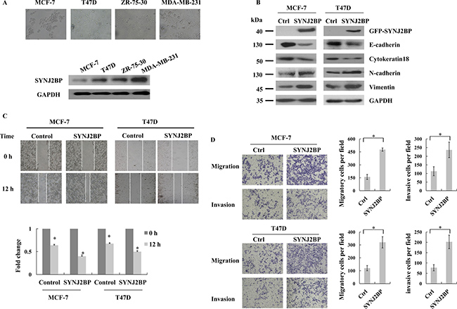 Figure 2: The effects of SYNJ2BP expression on breast cancer cellular EMT phenotype. (A) Phase-contrast microscopic images of the human breast cancer cell lines MCF-7, T47D, ZR-75-30, MDA-MB-231 (up), and western blot analysis of SYNJ2BP expression in these cells (down). (B) Western blot showing the effects of SYNJ2BP overexpression on the expression levels of E-cadherin, Cytokeratin 18, N-cadherin and Vimientin in MCF-7 and T47D cells. (C) Scratch wound-healing assay assessing the effects of SYNJ2BP overexpression on the motility of MCF-7 and T47D cells. The bar graph shows the fold change of 12 h compare with 0 h wound-healing, 0 h is set to 1. (D) Trans-well migration and invasion assay evaluation the effects of SYNJ2BP overexpression on the cellular motility and invasion ability of MCF-7 and T47D cells. The bar graph shows the number of migrating and invading cells for each category of cells (right).