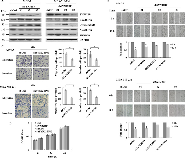 Figure 3: The effects of SYNJ2BP ablation on breast cancer cellular EMT phenotype. (A) Western blot showing the effects of SYNJ2BP knockdown on the expression levels of E-cadherin, N-cadherin, Vimientin in MCF-7 and MDA-MB-231 cells. (B) Scratch wound-healing assay assessing the effects of SYNJ2BP knockdown on the motility of MCF-7 and MDA-MB-231 cells. The bar graph shows the fold change of 12 h compare with 0 h wound-healing, 0 h is set to 1. (C) Trans-well migration and invasion assay evaluation the effects of SYNJ2BP knockdown on the cellular motility and invasion ability of MCF-7 and MDA-MB-231 cells. The bar graph shows the number of migrating and invading cells for each category of cells (right). (D) MTT assays showing the effect of SYNJ2BP on cell proliferation in MCF-7 cells within 24 and 48 hours.