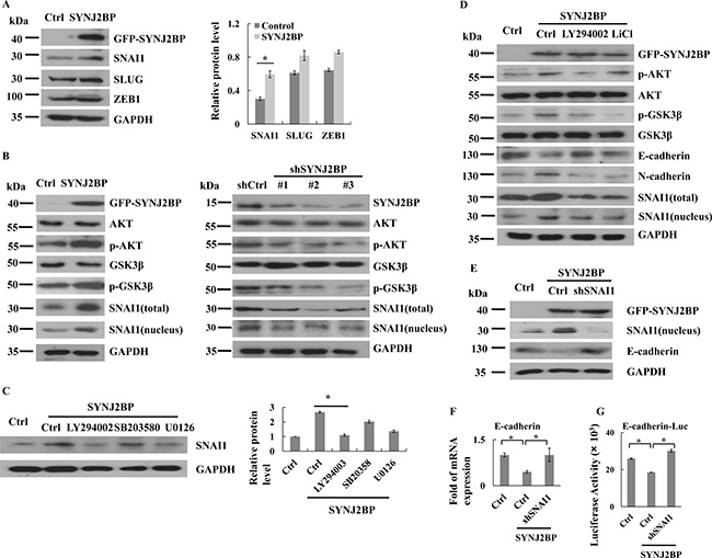 Figure 4: SYNJ2BP regulates breast cancer cellular EMT via PI3K/AKT/GSK3β/SNAI1. (A) Western blots showing that effects of SYNJ2BP overexpression on the expression levels of SNAI1, SLUG, ZEB1. The bar graph showing the relative band intensity of SNAI1, SLUG, ZEB1 expression levels normalized to GAPDH (right). (B) Western blots showing that effects of SYNJ2BP overexpression (left) or knockdown (right) on the expression levels of AKT, pAKT, GSK3β, pGSK3β, SNAI1 and pSNAI1. (C) Western blot showing that effects of SYNJ2BP overexpression with or without LY294002 (24 nM) or U0126 (10 mM) or SB203580 (20 mM) treatment on the expression levels of SNAI1. (D) Western blot showing that effects of SYNJ2BP overexpression with or without LY294002 (24 nM) or LiCl (10 mM) treatment on the expression levels of AKT, pAKT, GSK3β, pGSK3β, SNAI1, E-cadherin and N-cadherin in MCF-7 cells. (E) Western blot analysis showing the reversion of repressed E-cadherin expression in SNAI1-knockdown cells by overexpression of SYNJ2BP. MCF-7 cells without or with SNAI1 knockdown were transfected with SYNJ2BP and the levels of SNAI1, E-cadherin and GAPDH in the cells were analyzed by western blot. RT-PCR analysis (F) and reporter-gene assay (G) showing the level of E-cadherin transcript in the different groups of cells in E.