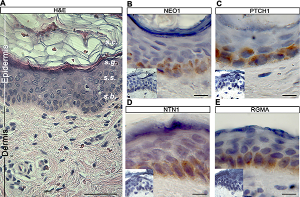 Figure 1: NEO1 is expressed in human epidermal basal cells. (A) H&E of human skin showing stratum corneum (s.c), granulosum (s.g.) squamous (s.s.), and basale (s.b) of epidermis (scale bar = 250 μm). IHC analysis of NEO1 (B), PTCH1 (C), NTN1 (D) and RGMA (E) shows expression (brown staining) in the basal cell population of human skin epidermis. Hematoxylin (blue) counterstain used to distinguish nuclei. All images are representative photographs from n = 3 (bar = 25 μm). Negative controls are shown as insets.