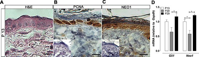 Figure 2: Neo1 expression and Shh/Gli pathway activity cycle in post-natal mouse skin. (A) H&E of mouse epidermis. IHC analysis of the proliferation marker PCNA (B) and NEO1 (C) shows expression (brown stain) in the proliferative basal cell population. Images are representative photographs of n = 3 on P13 (bar = 25 μm). Negative controls are shown as insets. (D) mRNA levels of both Gli1 and Neo1 were assessed by qPCR, the expression of Gli1 and Neo1 cycle across different ages (n = 8). Data is shown as Mean ± SEM and normalized against mean value for P13 with *p < 0.05 according to Mann-Whitney test.