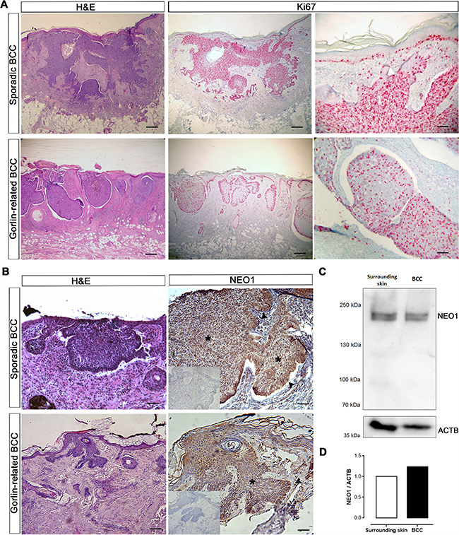 Figure 3: NEO1 is expressed in human BCC. (A) H&E of sporadic and Gorlin syndrome-related BCC biopsies (bar = 1000 μm). IHC of Ki67 (pink stain) shows highly proliferative tumor cells (bar = 1000 μm and 250 μm). Images are representative photographs of n = 32. (B) H&E of sporadic and Gorlin syndrome-related BCC biopsies (bar = 1000 μm). IHC analysis of NEO1 shows expression (brown staining) in nodules of human BCC biopsies both in the bulk of tumors (asterisk) and palisade (arrow). Hematoxylin (blue) counterstain was used to distinguish nuclei. Negative control of IHC is shown as an insert. Images are representative photographs from n = 32 for sporadic BCC and n = 4 for Gorlin syndrome-related BCC (bar = 500 μm). (C) NEO1 expression in a non-aggressive sporadic human BCC and its healthy surrounding skin was evaluated by WB, ACTB is shown as a loading control. (D) Graph depicting the levels of NEO1 in BCC compared to its surrounding skin evaluated in (c) and normalized by ACTB expression.