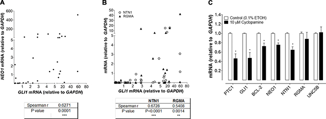 Figure 4: Positive correlation between NEO1 signaling and SHH/GLI pathway activation. (A–B) mRNA levels of NEO1, GLI1, NTN1 and RGMA were quantified by qPCR in sporadic human BCC samples. (A) mRNA levels of NEO1 have a positive and significant correlation with GLI1 levels in human BCC samples (n = 32). Spearman r and P values were calculated and are shown in the table, ***p ≤ 0.001. (B) mRNA levels of NEO1 ligand: NTN1(○) and RGMA(▲) also correlate with GLI1 levels. For each ligand, Spearman r and P values were calculated and are shown in the table, **p < 0.01; ***p ≤ 0.001. (C) Five human BCC samples were cultured as explants and treated with 10 μM cyclopamine or vehicle control (ETOH 0.1%) for 48 h. Cyclopamine treatment decreases the expression of downstream targets such as GLI1, PTCH1, BCL2 and also NEO1. Of NEO1 ligands only NTN1 expression was diminished after inhibitor treatment. Levels of UNC5B, another reported NTN1 receptor with no-known relationship to the SHH/GLI pathway is shown as control. Data are represented as mean ± SEM with * p < 0.05 according to Mann-Whitney test.