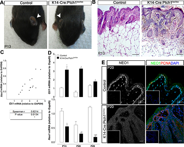 Figure 5: Neo1 decreases with BCC tumor progression. (A) K14-Cre:Ptch1lox/lox mouse generate skin lesions, being the phenotype at early ages mostly evident in ears (white arrows indicate ears of control and K14-Cre:Ptch1lox/lox mice on P13) (B) H&E staining of ear skin showing micronodular BCC-like lesions in comparison to control skin on P13 mouse (bar = 100 μm). (C) mRNA levels were quantified by qPCR, showing a significant correlation between Gli1 and Neo1 levels on K14-Cre:Ptch1lox/lox skin (n = 7). (D) Gli1 mRNA levels of K14-Cre:Ptc1lox/lox skin (n = 7) are upregulated in comparison to age-matched controls skin (n = 8) at postnatal days P13, P20 and P29. Neo1 mRNA levels are downregulated in K14-Cre:Ptch1lox/lox in comparison to age-matched controls skin. Levels of Neo1 diminish significantly with tumor progression. Data is represented as mean ± SEM with p < 0.05 vs. age-matched control (*), K14-Cre:Ptc1lox/lox P13 (ϕ), or K14-Cre:Ptc1lox/lox P20 (δ); according to Mann-Whitney test. (E) NEO1 IF shows localization on basal cells of P20 control skin and dimmer staining on P20 K14-Cre:Ptch1lox/lox skin, both on tumor nodules and epidermis. Proliferating tumor and basal cells are identified by PCNA staining (red). DAPI (blue) was used for nuclei staining (bar = 20 μm). Negative controls are shown as insets.