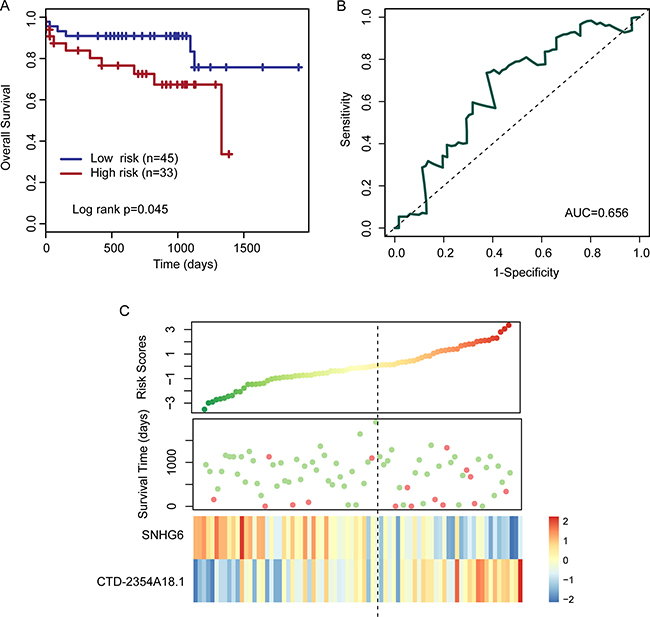 Figure 1: Kaplan–Meier and ROC curves for the two-lncRNA signature in the training set. (A) Kaplan–Meier curves for high- and low-risk groups obtained from the training set (n = 79) divided by the median cutoff point. (B) Time-dependent ROC analysis for the two-lncRNA signature at three years of OS. (C) Risk score distribution, patients’ survival status and expression heatmap of two lncRNA biomarkers.