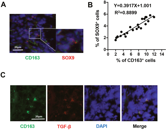 Figure 1: Number of TAMs is correlated with SOX9 expression in NSCLC. (A) Immunofluorescent staining of human NSCLC tumor tissues. CD163+ macrophages are stained green and SOX9+ lung cancer cells are stained red. Nuclei were stained with DAPI (blue). (B) Linear regression revealed a positive correlation between numbers of CD163+ macrophages and SOX9+ lung cancer cells. CD163+ macrophages and SOX9+ lung cancer cells within a distance of 100 μm were counted in 22 separate microscope fields. (C) CD163+ macrophages express TGF-β; CD163 is stained green, TGF-β red, and nuclei blue.