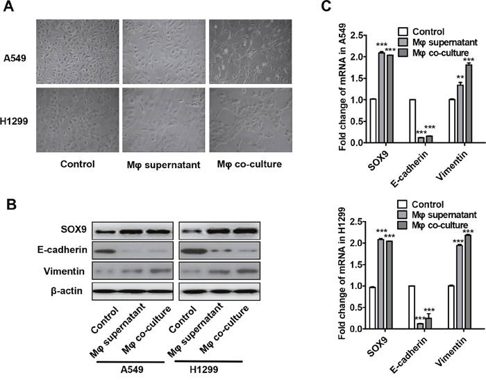 Figure 6: Macrophages induced SOX9-dependent EMT-like phenotype in lung cancer cells. SOX9 expression was inhibited in A549 and H1299 cells via RNAi. (A) Changes in lung cancer cell morphology after macrophage supernatant was added to A549 and H1299 cells or after co-culture of macrophages with A549 and H1299 cells for 48h. (B) Changes in SOX9, E-cadherin, and vimentin protein levels in lung cancer cells after macrophage supernatant was added to A549 and H1299 cells or after co-culture of macrophages with A549 and H1299 cells for 48h.