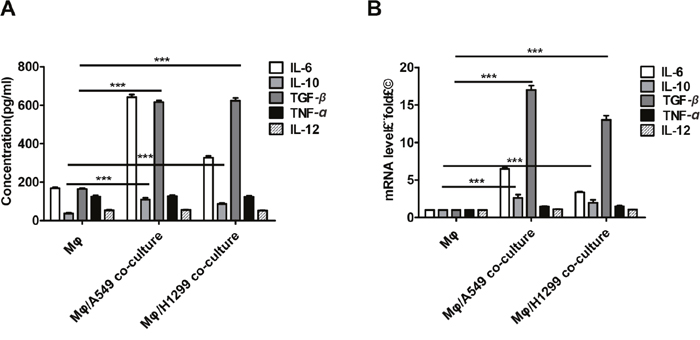 Figure 4: Lung cancer cells induced M2 polarization in macrophages. (A-B) TGF-β, IL-10, IL-6, and TNF-α protein (A) and mRNA (B) levels in supernatant were determined by ELISA and qRT-PCR, respectively, after incubation with THP-1-derived macrophage supernatants or after co-culture of THP-1-derived macrophages with H1299 or A549 cells for 48 h. ***p < 0.01, mean ± SEM.