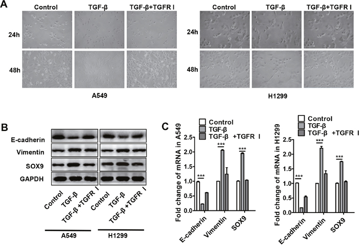Figure 5: TGF-β increased SOX9 expression and induced transformation into an EMT-like phenotype in lung cancer cells. (A) Changes in lung cancer cell morphology after recombinant TGF-β (10ng/ml) or TGF-β receptor inhibitor (TGFR I, SD208, 1μM) was added to A549 and H1299 cell culture systems for 24 or 48 h. (B-C) Changes in SOX9, E-cadherin, and vimentin protein (B) and mRNA (C) levels in lung cancer cells after recombinant TGF-β or TGFR I was added to A549 and H1299 cell culture systems for 48 h. ***p < 0.01, mean ± SEM.