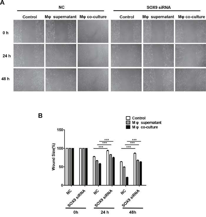 Cells were seeded in a 6-well plate and allowed to grow to nearly 100% confluence in culture medium. Subsequently, a cell-free line was manually created by scratching the confluent cell monolayers with a 200 μL pipette tip. The wounded cell monolayers were washed three times with PBS and incubated in RPMI 1640 with 10% FBS for 48 hours after macrophage supernatant was added or after co-culture of macrophages. Images of five randomly-selected scratched fields were captured using a bright-field microscope (IX51; Olympus). Wound closure percentage was measured using Adobe Photoshop CS2 (Adobe Systems Inc., San Jose, CA, USA). The experiment was performed independently three times to generate triplicate measurements.