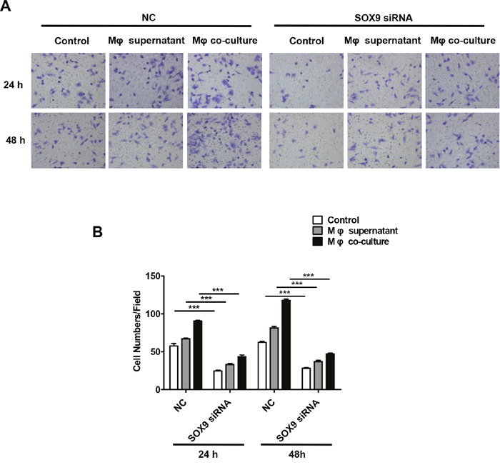 Figure 8: Macrophages promote SOX9-dependent invasion in lung cancer cells. SOX9 expression was inhibited in A549 cells via RNAi. (A) Invasion assays were performed 48 hours after macrophage supernatant was added to A549 cells or after co-culture of macrophages with A549 cells. (B) Total numbers of invaded cells were quantified after macrophage supernatant was added to A549 cells or after co-culture of macrophages with A549 cells. ***p < 0.01, mean ± SEM.