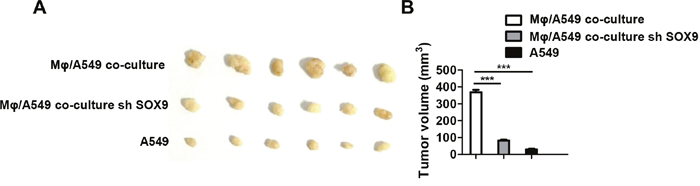 Healthy purebred BALB/C nude mice (6 weeks old) were maintained according to the guidelines for the administration of laboratory animal research as outlined by the Institutional Animal Care and Use Committee of Harbin Medical University in China and the Care and Use of Laboratory Animals (National Institutes of Health, revised 1985). To assess the effect of macrophages or SOX9 on tumor growth, A549 control, shSOX9-A549/macrophage-treated, or A549/macrophage-treated cells (5×106 cells in 100μL of PBS) were injected into the ventral regions of six female BALB/C nude mice. Tumor growth was monitored weekly by measuring perpendicular tumor diameters (length (L) and width (W)) with a Vernier caliper. Tumor volume (V) was calculated using the formula V = LW2/2. The research protocol was approved by the institutional ethics committee for the administration of laboratory animals of Harbin Medical University, China.