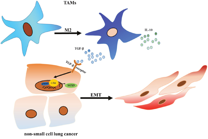 In 2016, primary lung cancer was one of the most common and deadly human cancers [29, 30]. Epithelial mesenchymal transition (EMT) plays an important role in the metastasis of lung cancer [31], and lung cancer cells undergo EMT when they are co-cultured with macrophages [27]. Although evidence suggests that macrophages promote EMT in lung cancer cells, the underlying molecular mechanisms remain unknown. In this study, we found that lung cancer cells promoted the M2 polarization of tumor-associated macrophages (TAMs), which in turn secretes TGF-β and promotes SOX9 expression via the C-jun/SMAD3 pathway, thereby promoting tumor metastasis (Figure 11).