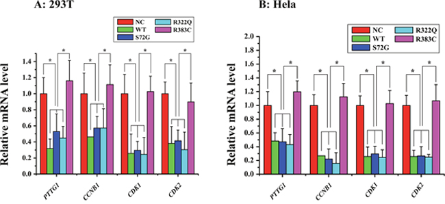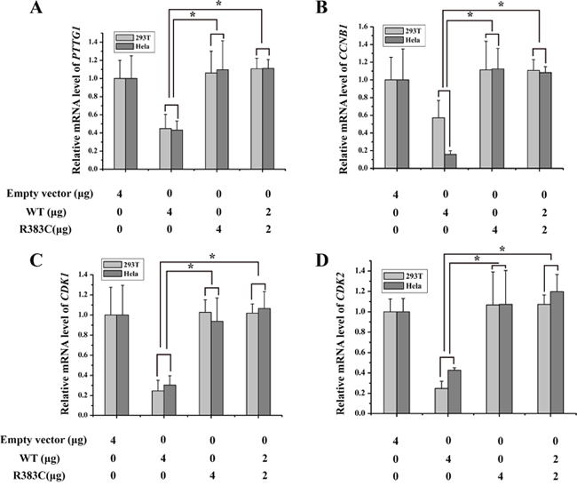 Figure 2: Relative mRNA expression of four proteins of interest in APC/CCDC20 mutant pathway in HeLa and 293T cells. Only in the CDC20 R383C mutant pathway, relative mRNA expression of all four kinds of regulators (PTTG1(securin), CCNB1(cyclin B), CDK1, CDK2) were increased compared with the CDC20 WT (*P<0.05).