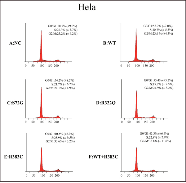 Figure 5: Cell count comparison in the cell cycle measured by flow cytometry in six cell lines between Hela and 293T cells. Including wild type (WT) cells, no special control (NC) cells, cells were transfected three missense mutants (S72G, R322Q, R383C) and cells were co-transfected WT and R383C. Relative G2/M cell ratio increased when the cells were transfected with CDC20 R383C mutant, or co-transfected with CDC20 R383C mutant and CDC20 WT.