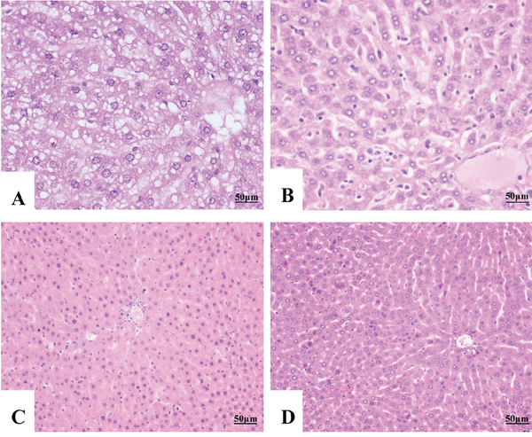 At the end of the treatment, 5 rats in each group were sacrificed, then liver tissue and pancreatic islet tissue were sampled, formalin-fixed and processed in paraffin routinely. Sections (5 μm) sliced from each block were stained with hematoxylin and eosin (H&E). And the aldehyde fuchsin staining method was performed to diagnose the pancreatic islet tissue. Accordingly, 5 μm sections were oxidized by Lugol's iodine solution (20-30 min), bleaching by 2.5% sodium thiosulfate (10 sec) and washing with water (3 min) and ethanol 65% (3 times). Aldehyde fuchsin staining (80 sec), washing with ethanol 60% (3 times) and acetic acid 0.5% (15 sec) were carried out. Then followed by ponceau staining (30 sec), washing with acetic acid 0.5% (15 sec), phosphotungstic acid solution 3% (10 sec), acetic acid 0.5% (15 sec) and NaOH 0.01% (10 sec). Brilliant Green staining 2% (1 sec) and differentiation with acetic acid 0.5% were performed. Moreover, ascending percentages of ethanol, clearing, and imaging with light microscope (Olympus× 400) were carried out.