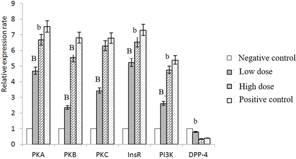 Sequences for primers of insulin related genes (InsR and DPP-IV), anti-apoptosis pathway (AKT, PKCα, PKA, PI3K) and β-Actin were obtained from Genbank and NCBI. Primers were designed with Primer Express software and synthesized at Shangong (Shanghai, China) (Table 6). For qRT-PCR reactions, 25 μL mixtures were made by using SYBR® Premix Ex TaqTM II (DRR820A, Takara) containing 12.5 μL SYBR® Premix Ex TaqTM II, 1.0μL of forward and 1.0 μL of reverse primer, 8.5 μL ribonuclease(RNase)-free water and 2 μL cDNA. The real-time PCR reaction conditions were consisted of 3 min at 95 °C (first segment, one cycle), 10 s at 95 °C and 30 s at Tm of a specific primer pair (second segment, 44 cycles) followed by 10 s at 95 °C, and 72 °C for 10 s (dissociation curve segment) using Thermal Cycler (C1000, BIO RAD, USA). The results from the qRT-PCR were analyzed with 2-ΔΔCT assay and β-Actin was used as an internal control gene. All data were presented in terms of relative mRNA, expressed as Means ±SE.