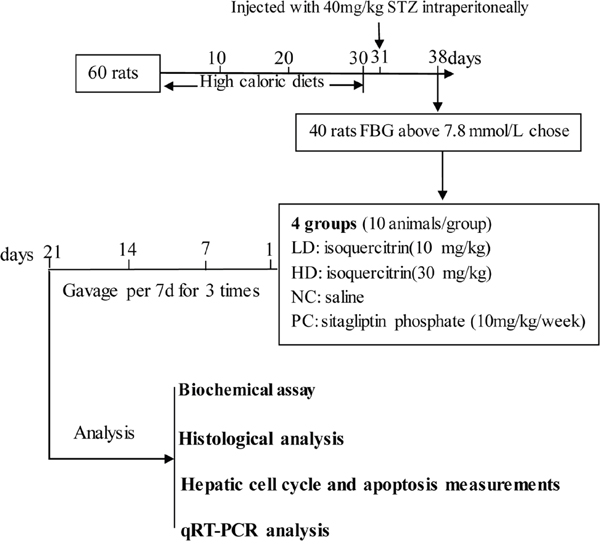 Thus, we hypothesis that isoquercitrin may also target the hepatocytes function in the course of therapy for T2DM. The aim of this study was to investigate the hepatoprotective potential of isoquercitrin by clinical symptoms observation, blood glucose level and biochemical indexes monitoring, MTT assay, histological analysis, flow cytometry assays and qRT-PCR analysis.