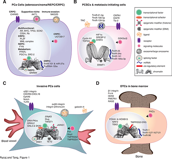 ) functions. Icons and their corresponding labels are shown in top right. See detailed discussions in the Text. (B) Molecular determinants in PCSCs and metastasis-initiating cells. PCSCs adopt many strategies in order to survive and initiate metastasis in foreign environments. For example, PCSCs express TNC, which functions in a non-canonical manner to aid in overcoming immune surveillance. CSCs transition between interchangeable states, regulated by the microenvironment, and this phenotypic plasticity (i.e., EMT, metabolic, tumor-initiating capacity) can play an important role in metastasis. Differentiation programming is dependent on unique combinations of cis and trans regulatory molecules, which cooperatively influence chromatin structure. Thus, chromatin structures differ between PCSCs and their differentiated progeny, as indicated by an “open chromatin” conformation in PCSC depicted. Tumor-suppressive miRNAs including miR-25, miR-34a, miR-141, and miR-199a-3p are generally devoid in PCSCs whereas onco-miRs such as miR-21 may be secreted by PCSCs in exosomes. Evidence suggests that CSCs are generally smaller than their differentiated progeny (compare with the cell in A). (C) Molecular determinants in invasive PCa cells. PCa cells become phenotypically more fibroblastic during the acquisition of invasive and migratory abilities, facilitating their intravasation into the blood vessels. Representative novel molecular determinants discussed in the Text are illustrated here. (D) Molecular determinants in DTCs in the bone marrow. Disseminating PCa cells may rely on unique molecules to home to more permissible distant microenvironment such as the bone. An example of dysregulation of a protein-coding gene is exemplified by TMPRSS2-ERG, which increases bone tropism of PCa cells. Once in the bone, DTCs can exploit various pathways in order to survive and initiate colonization.