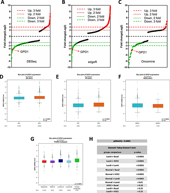 Figure 1: The expression pattern of GPD1 in human breast cancer. (A–B) Distribution of fold changes illustrated in gene expression profiles for the 30 breast cancer cases (10 normal and 20 tumours). The log2 values were calculated for each sample by normalizing to read counts alone (log2Fold Change). Gene expression analysis was performed using R version 3.2.2 software with DESeq package (p-value < 0.01 and log2 Fold Change > 3) (A) and edgeR package (p-value < 0.01 and log2 Fold Change > 3) (B). RNAseq data were downloaded from TCGA database. (C) Distribution of fold changes for the top 200 significantly changed genes in human breast cancer obtained from a Oncomine dataset which contains 19,273 measured genes from 2,136 breast cancer samples based on Illumina HumanHT-12 V3.0 R2 Array. (D–F) Expression analysis for GPD1 with positive versus negative receptor IHC status (ER, PR and HER2) (n = 5,510). (G–H) Expression analysis for GPD1 according to PAM50 subtypes (n = 5,299). Dunnett-Tukey-Kramer’s test was used for group comparisons.