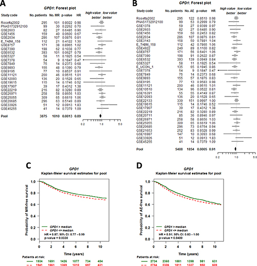 Figure 2: GPD1 expression is correlated with overall survival of breast cancer patients. (A–B) Forest plot shows the impact of GPD1 expression on MR- (A) and AE-free (B) survival. (C–D) Kaplan-Meier survival curves for the association between GPD1 expression and the probability of MR- and AE- free survival. The green curve represents the 50% of patients with higher GPD1 expression than the median expression level. In contrast, the red dashed curve represents the 50% of patients with lower GPD1 expression than the median expression level. “Patients at risk” refers to patients who are at risk of the event occurrence, such as death or metastatic relapse.