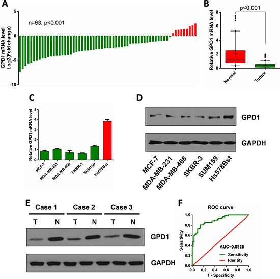 Figure 4: GPD1 is downregulated in human breast cancer. (A) qRT-PCR analysis of GPD1 mRNA expression in 63 pairs of human breast cancer tissues and their corresponding adjacent normal tissues. GPD1 expression was normalized to GAPDH in each sample. (B) Box plot of GPD1 expression in human breast cancer tissues and adjacent normal tissues, Boxes represent interquartile ranges, and the horizontal lines across each box indicates the median values. (C) qRT-PCR analysis of GPD1 expression in human breast cancer cells (MCF-7, MDA-MB-231, MDA-MB-468, SKBR-3 and SUM159) and normal breast cells (Hs-578Bst). (D) Western blot analysis of GPD1 expression in human breast cancer cells (MCF-7, MDA-MB-231, MDA-MB-468, SKBR-3 and SUM159) and normal breast cells (Hs-578Bst). (E) Western blot analysis of GPD1 expression in 3 pairs of human breast tissues and their corresponding adjacent normal tissues. (F) The ROC curve of GPD1 expression in human breast cancer patients. Analysis of the GPD1 expression levels resulted in an area under the curve (AUC) value of 0.89, with a standard error of 0.027 and a 95% confidence interval of 0.84–0.95. Data are presented as the mean ± SD. Two-tailed Student’s t-test was used.