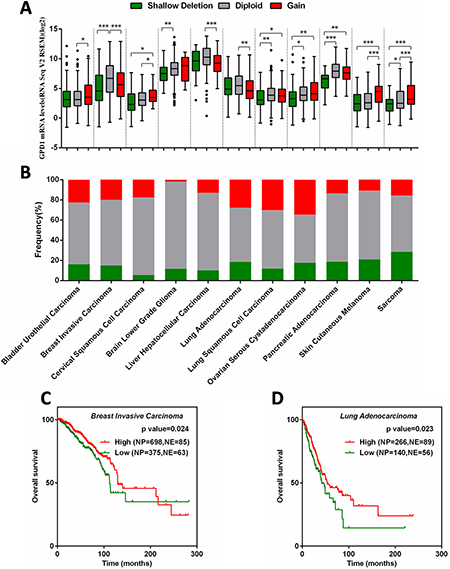 Figure 6: Correlation between GPD1 mRNA expression and disease outcome in several types of human cancers. (A) Correlation between GPD1 mRNA expression levels and genomic alterations. (B) Frequencies of GPD1 genomic alterations in different types of human cancers. (C) Kaplan-Meier curves for GPD1 in breast invasive carcinoma patients. (D) Kaplan-Meier curves for GPD1 in lung adenocarcinoma patients. NP refers to Number of Patients; NE refers to Number of Events.